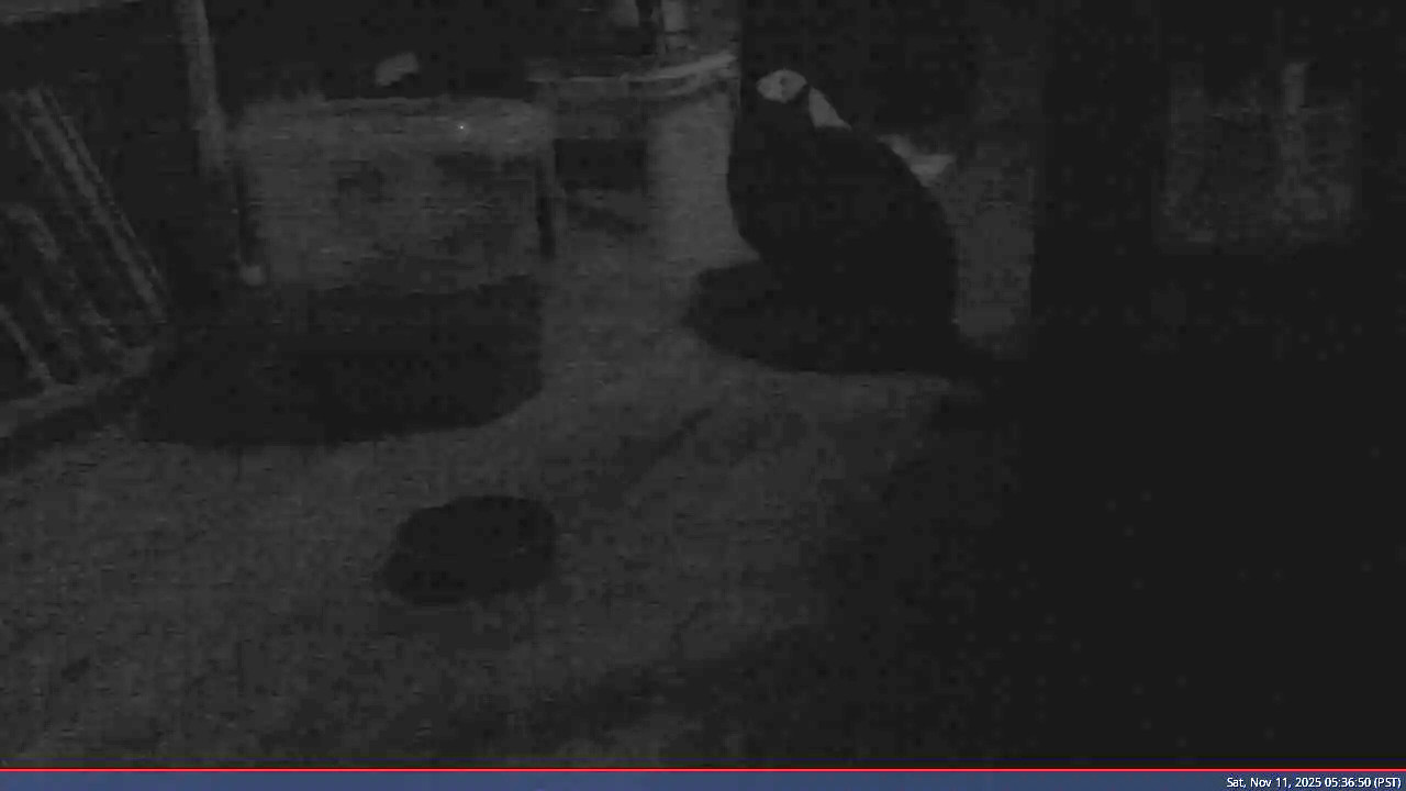 It's grainy and dim because even with all the settings, these cameras really are meant for video conferencing in reasonably well-lit rooms. We left only one light on, and turned it down as far as we could with a dimmer switch. For the cats, having the lights on all night is unusual, and we were worried even that much light would change their patterns, it it only took them one night to adjust. The second night we got the evidence we expected, and it does look a little like one of the surveillance tapes from a true-crime show,